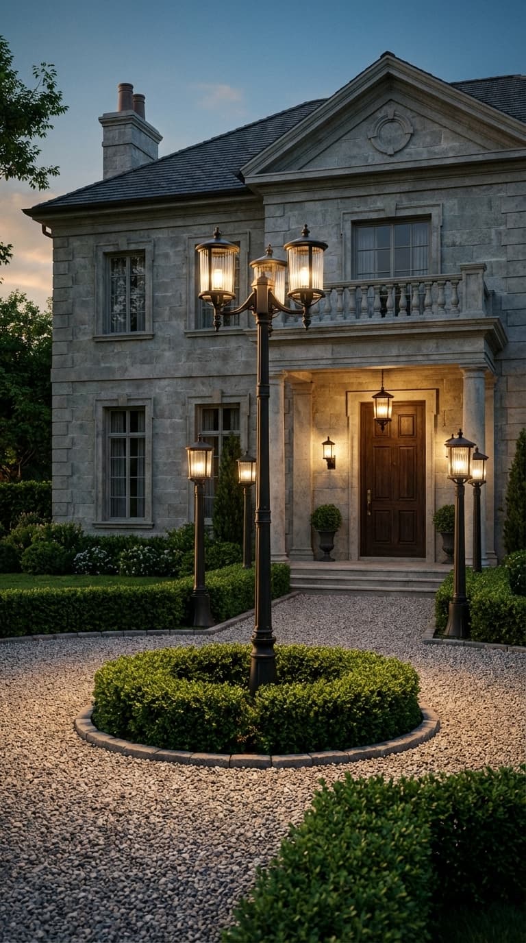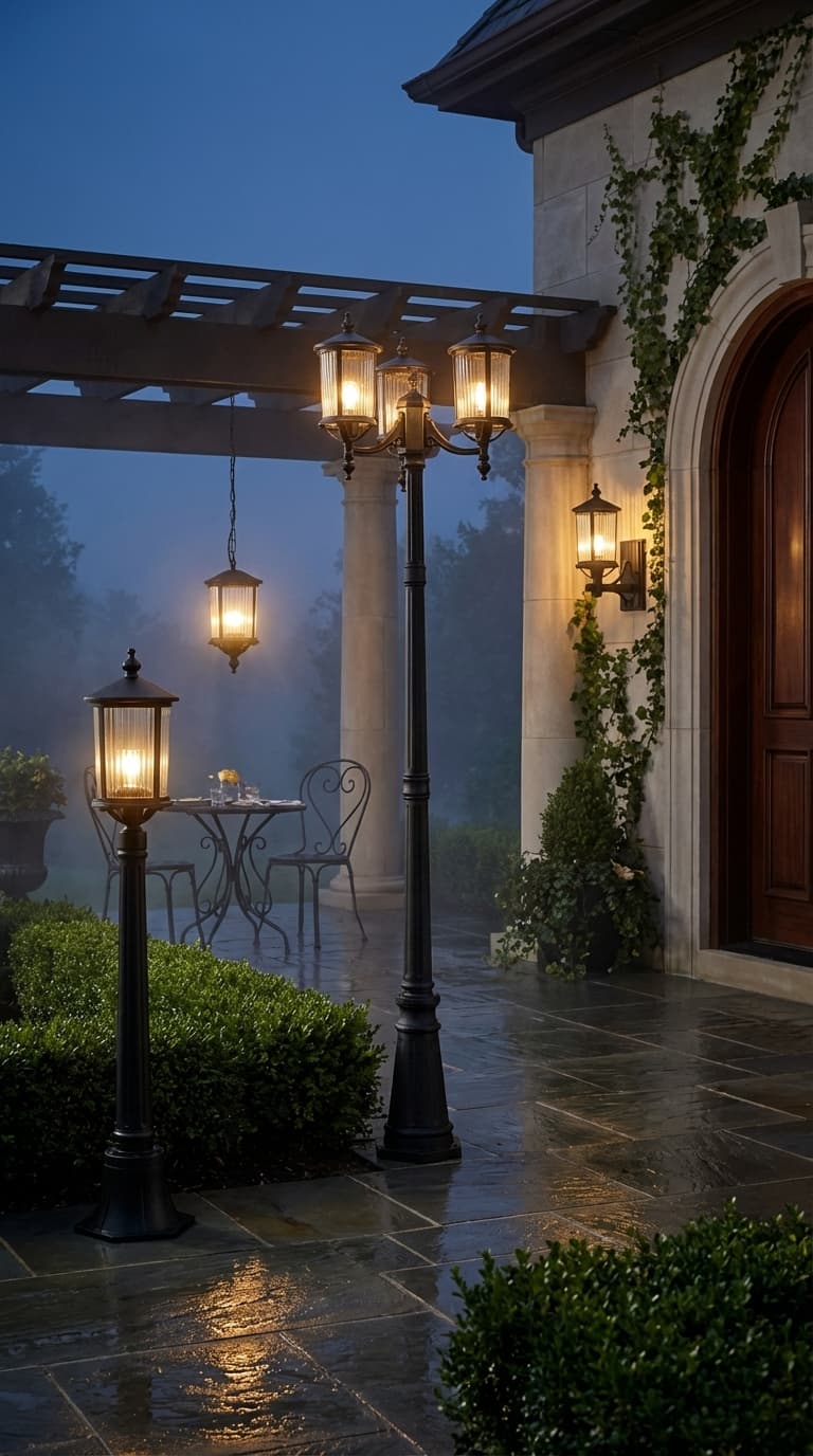 Czarna latarnia ogrodowa, wysoka lampa z trzema punktami świetlnymi