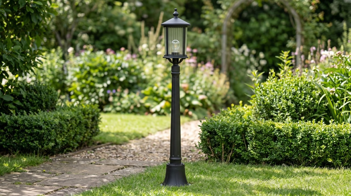 Czarna lampa stojąca, ogrodowa, oświetlenie alejek, na jedną żarówkę